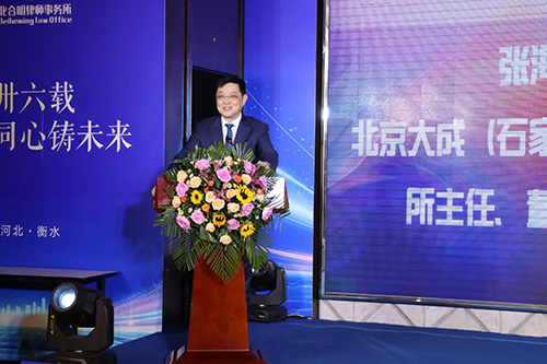 庆典伊始,合明律师事务所主任李长先代表合明律所对北京大成(石家庄)律师事务所主任、董事局主席张海水及各位律师,和到场来宾表示热烈欢迎和感谢,并发表欢迎致辞。他表示,36年风风雨雨,合明从旭日初升到蒸蒸日上,离不开每一位合明人的努力和奋斗。如今,合明站在新的起点,翻开新篇章,希望合明人不忘初心,与时倶进,在发展中创新,在创新中超越!