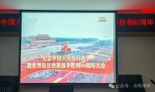 2025年9月3日,纪念中国人民抗日战争暨世界反法西斯战争胜利80周年阅兵活动在北京天安门广场隆重举行。河北合明律师事务所组织全体律师及工作人员集中观看直播,以庄重的方式回望历史、缅怀先烈,凝聚起以法治力量守护和平、服务社会的坚定信念。